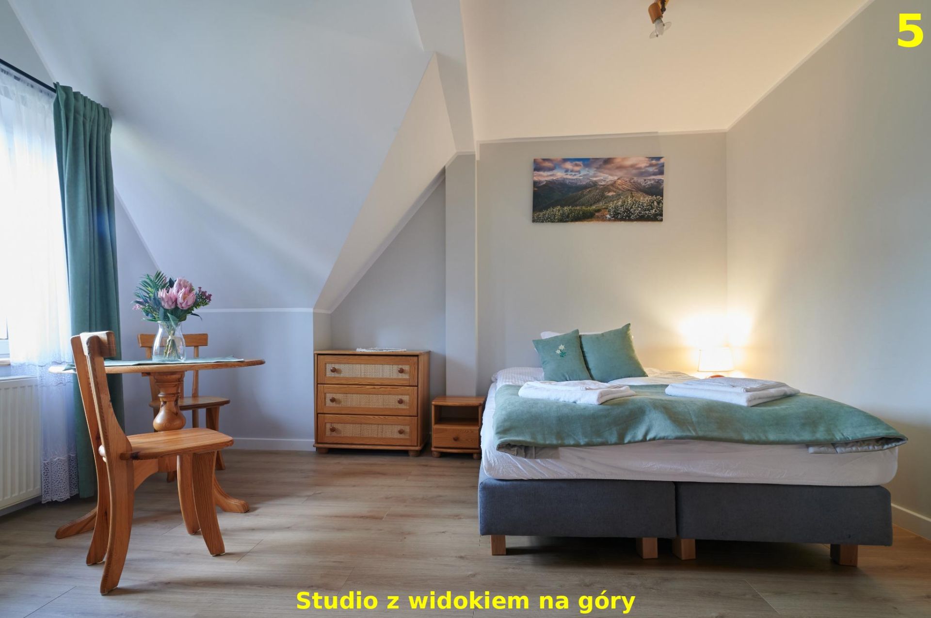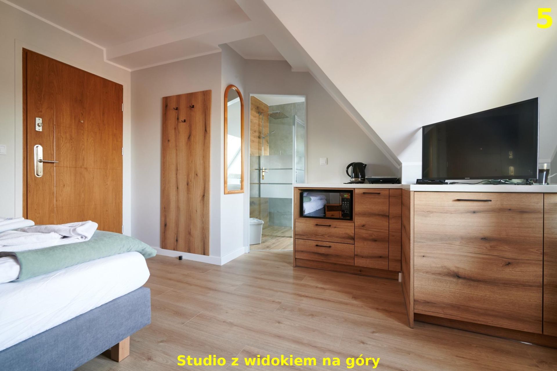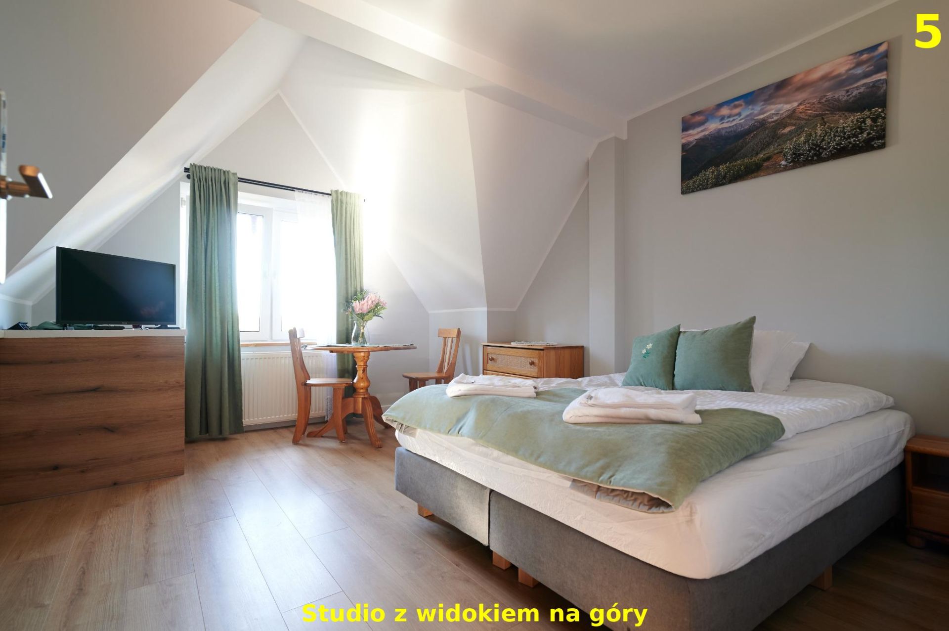 To komfortowe studio zlokalizowane na 2. piętrze oferuje piękny widok na panoramę Tatr, który można podziwiać zarówno przy porannej kawie, jak i wieczornym relaksie. Wnętrze zostało zaprojektowane z myślą o wygodzie i przytulnej atmosferze – znajduje się tu podwójne łóżko, stół dla 2 osób, aneks kuchenny wyposażony w niezbędne sprzęty do przygotowania posiłków oraz prywatna łazienka z prysznicem. Dzięki dużym oknom apartament jest jasny i pełen naturalnego światła, a widok na góry sprawia, że pobyt nabiera wyjątkowego charakteru. To idealna przestrzeń dla par, solo podróżujących lub małych rodzin, które szukają wypoczynku z dala od zgiełku, a jednocześnie blisko natury i górskich szlaków.