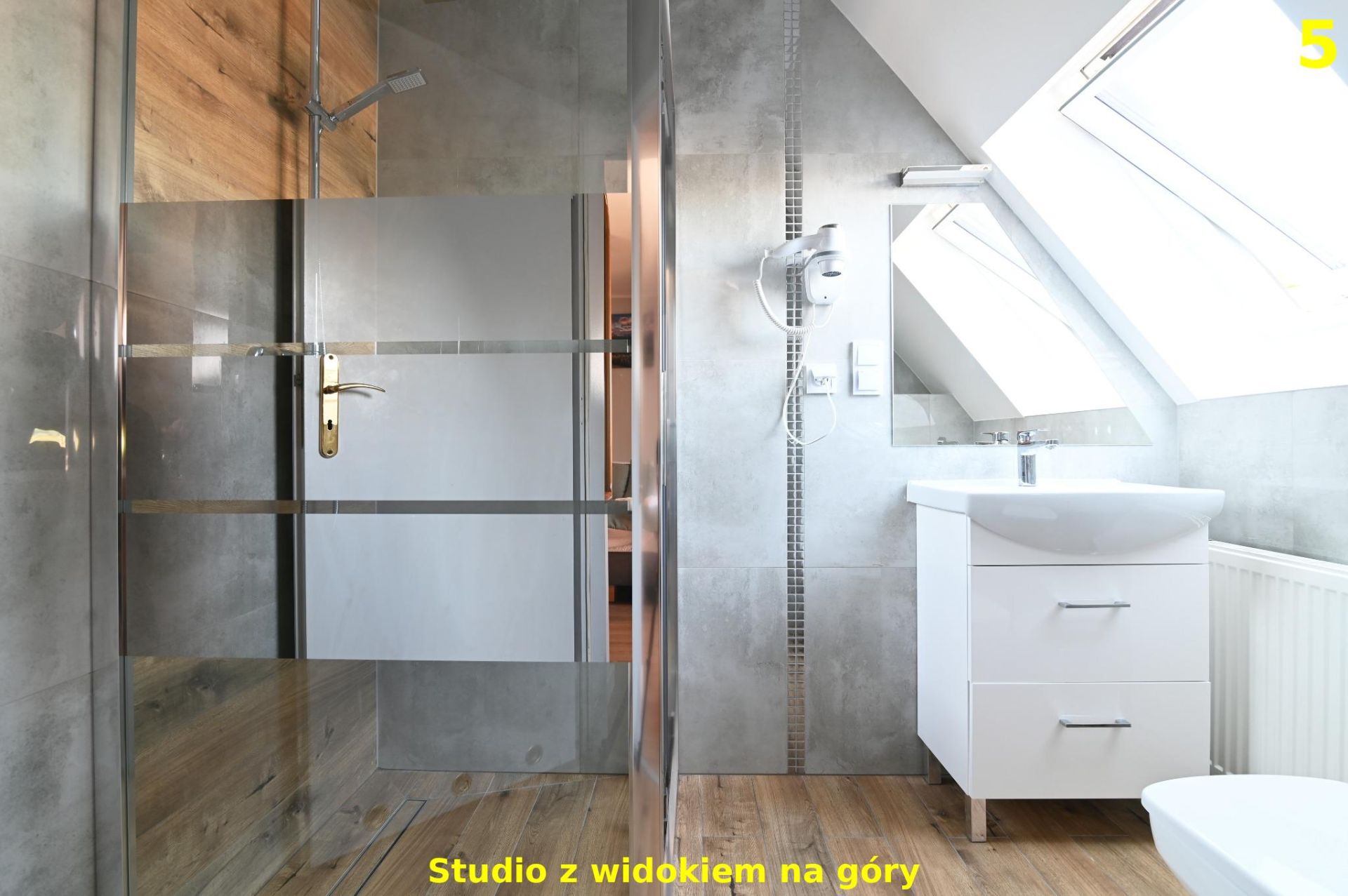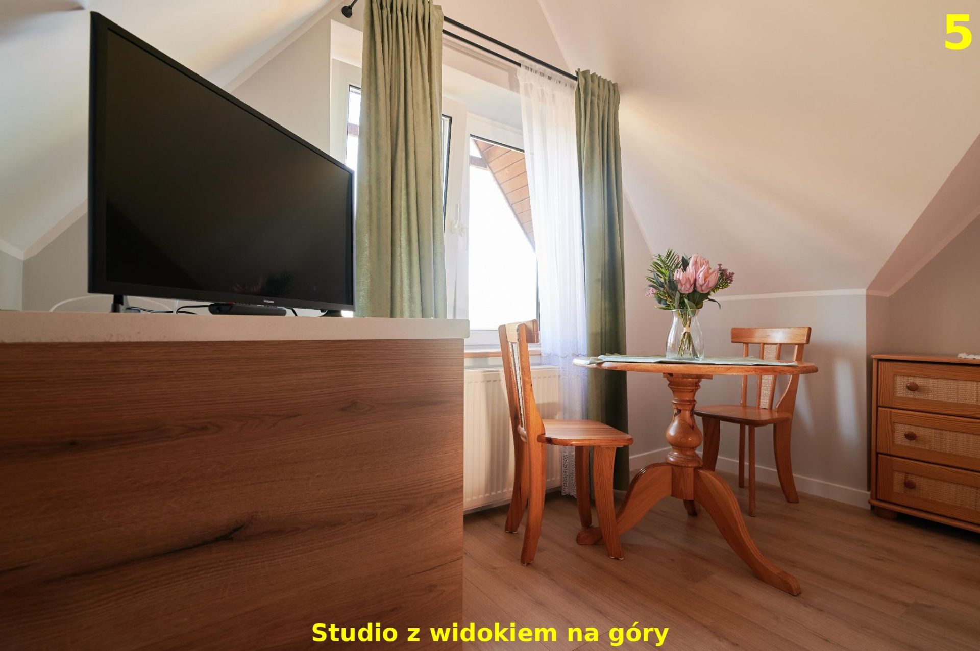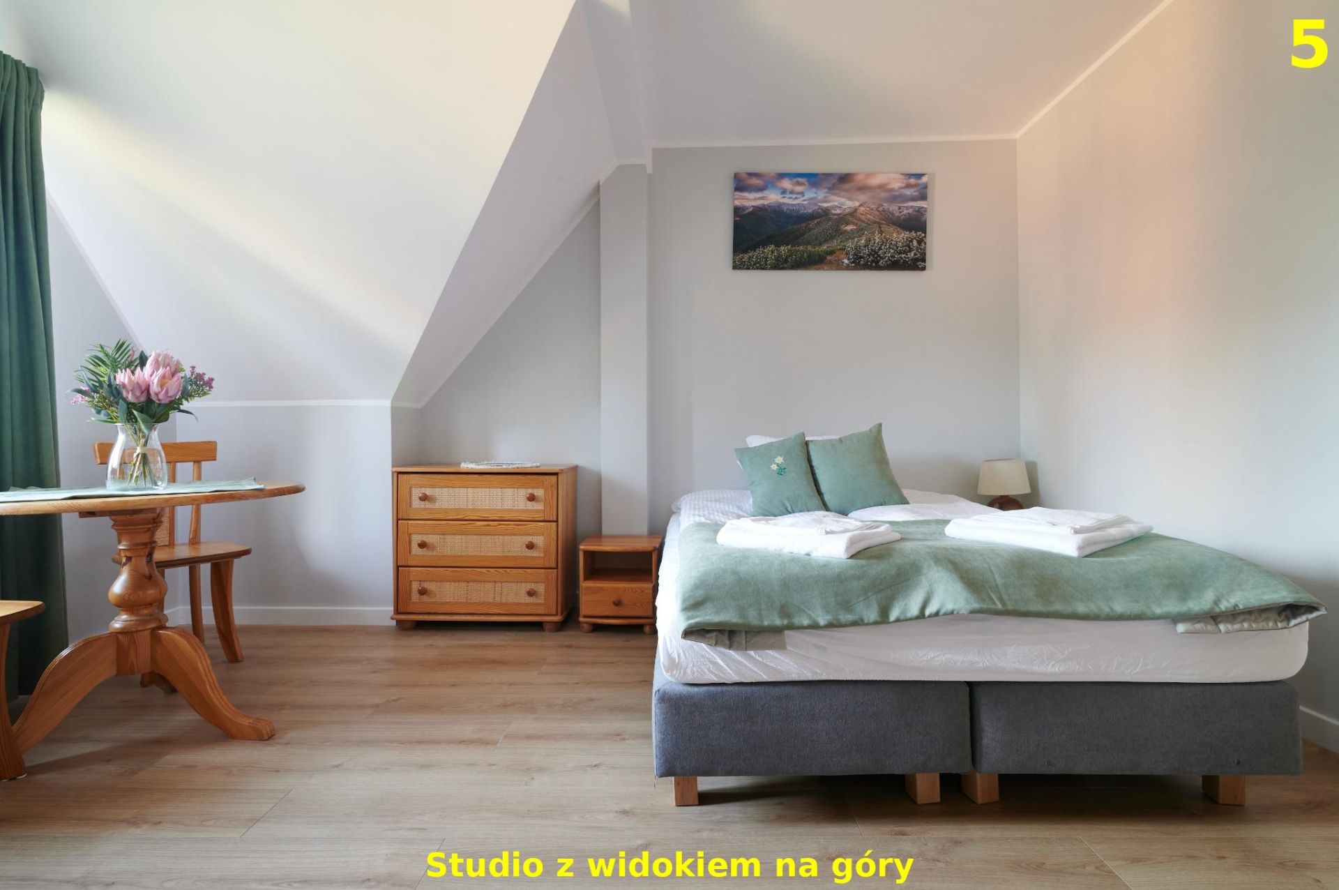 To komfortowe studio zlokalizowane na 2. piętrze oferuje piękny widok na panoramę Tatr, który można podziwiać zarówno przy porannej kawie, jak i wieczornym relaksie. Wnętrze zostało zaprojektowane z myślą o wygodzie i przytulnej atmosferze – znajduje się tu podwójne łóżko, stół dla 2 osób, aneks kuchenny wyposażony w niezbędne sprzęty do przygotowania posiłków oraz prywatna łazienka z prysznicem. Dzięki dużym oknom apartament jest jasny i pełen naturalnego światła, a widok na góry sprawia, że pobyt nabiera wyjątkowego charakteru. To idealna przestrzeń dla par, solo podróżujących lub małych rodzin, które szukają wypoczynku z dala od zgiełku, a jednocześnie blisko natury i górskich szlaków.